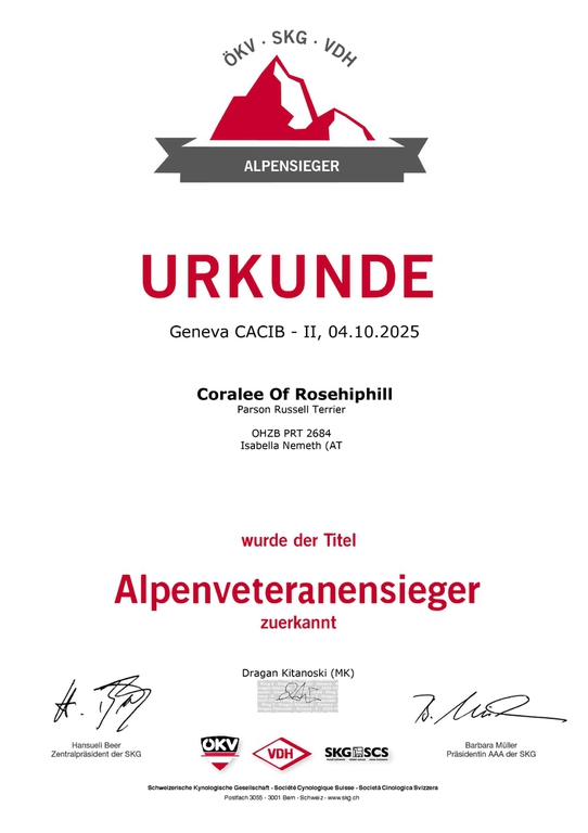 Bei der grossen internationalen Alpensieger-Dog Show in Genf hat für Coralee of Rosehiphill wieder einmal alles gepasst. Von Richter Dragan Kitanoski (MKD) ist Coralee zur Besten Parson Russell Terrier Hündin gesamt (BOS) gerichtet worden. Sie hat sich gegen alle Hündinnen, auch die der Champion-Klasse, durch-setzen können. Und die Konkurrenz in Genf ist sehr stark!