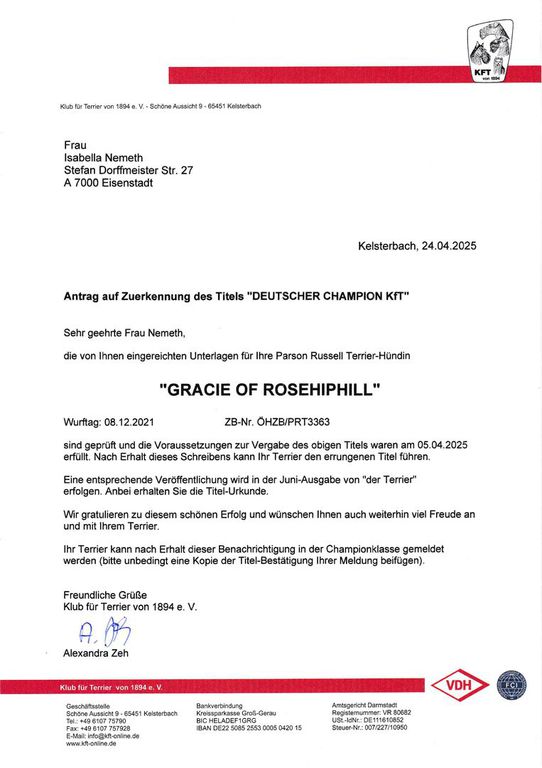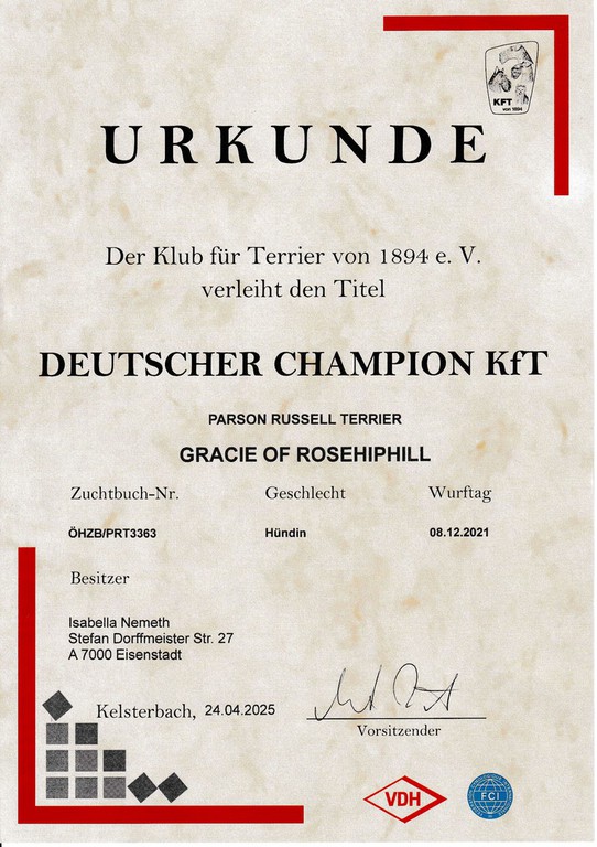 Weil in Deutschland die Konkurrenz am größten ist, gilt der Deutsche Champion als einer der schwierigsten überhaupt. Gracie of Rosehiphill hat bei allen Dog Shows in Deutschland, wo sie angetreten ist, bei den Anwartschaften voll gepunktet. Als Lohn dafür wurde sie vom Deutschen Klub für Terrier mit dem Titel Deutscher Champion KfT ausgezeichnet!