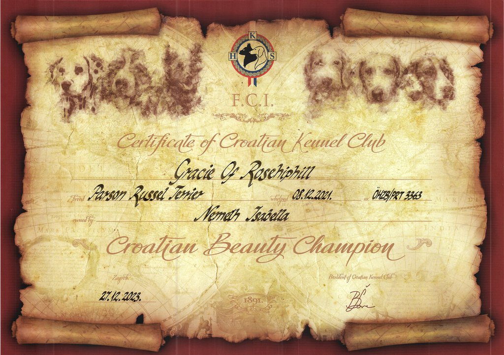 Weil Gracie of Rosehiphill bei allen 4 Slavonija Dog Shows zum besten Parson Russell Terrier gesamt gerichtet wurde, hat sie nun im Mindestalter von