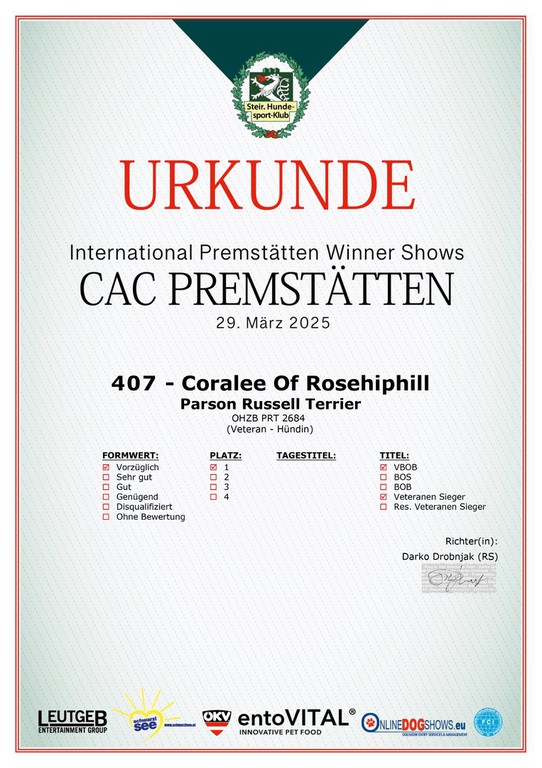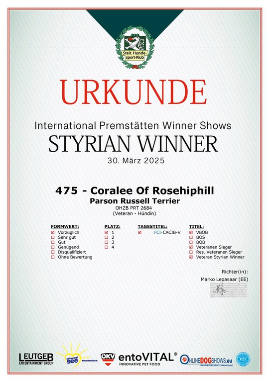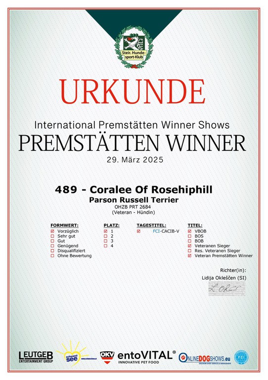Die internationale 3-fach Dog Show in Premstätten (A) war für Coralee of Rosehiphill ein voller Erfolg. Bei den Richtern Frau Lidija Oklesecen (SLO), Darko Drobnjak (SRB) und Marko Lepesaar (Estland) hat Coralee alle 3-mal den Besten Parson Russell Terrier Veteran gesamt geschafft!
